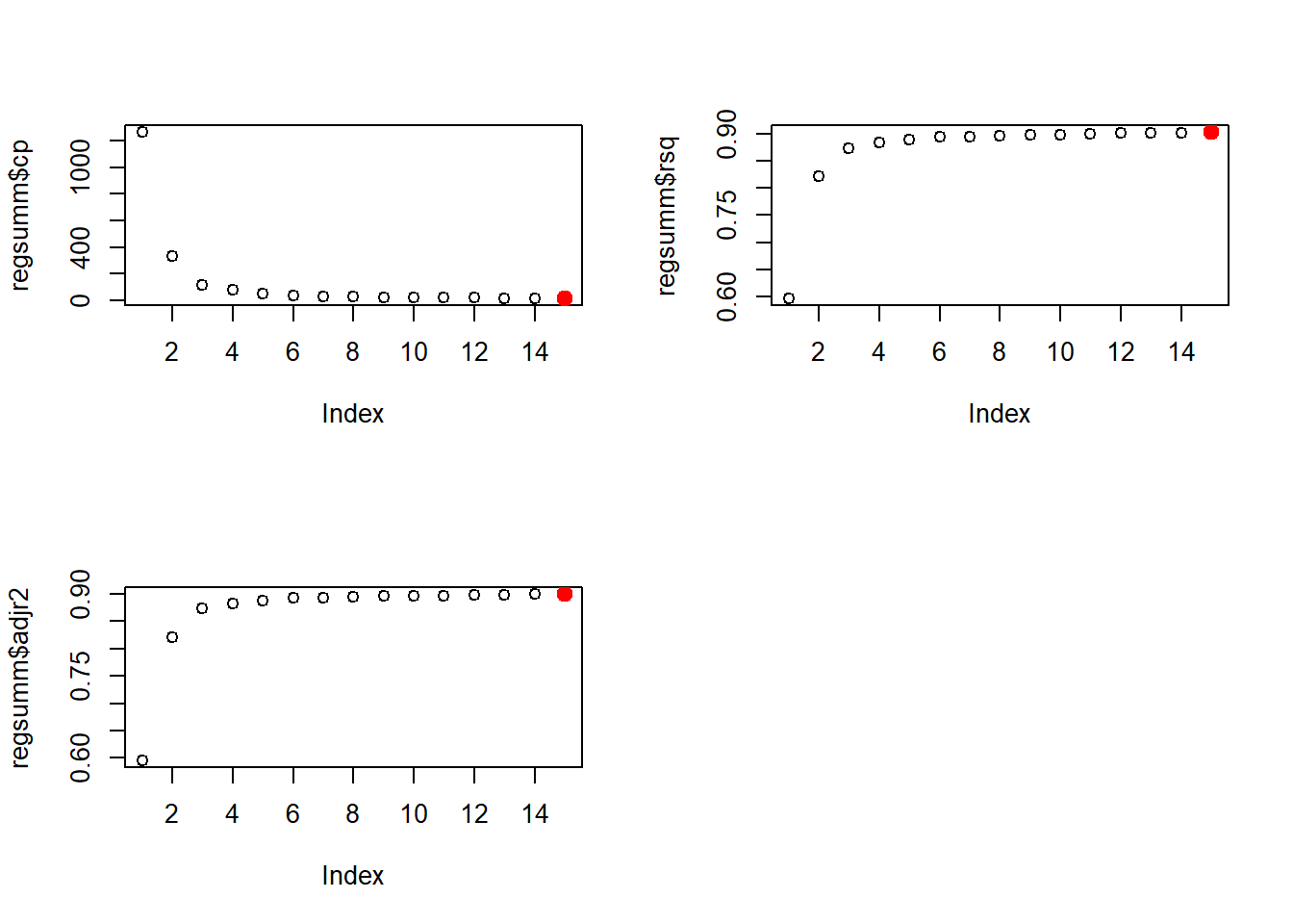 points(which.max(regsumm$adjr2), regsumm$adjr2[which.max(regsumm$adjr2)], col = "red", cex = 2, pch = 20)