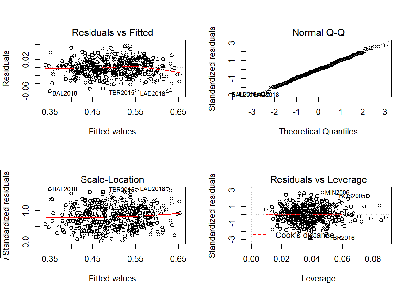 獨立性。因反應變數是各個年份的所有球隊勝率,因此多少有樣本間不獨立的問題,但因資料涵蓋多個年份,因此可減低同年互相影響的問題。