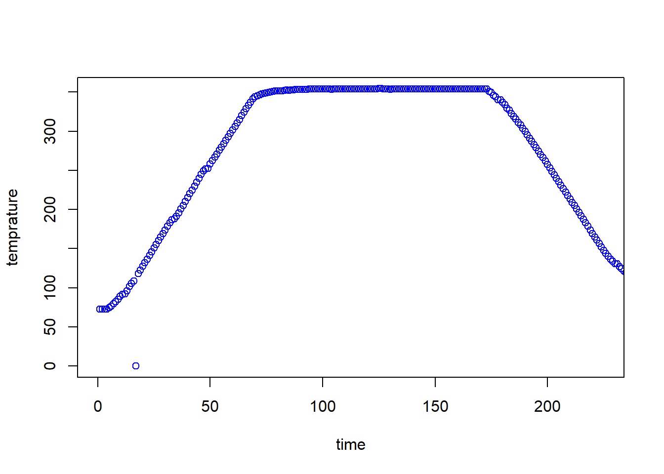plot(temprature,xlab = "time", xlim = c(0,225),col="blue")