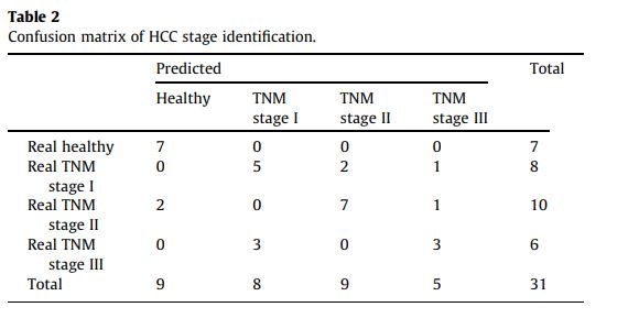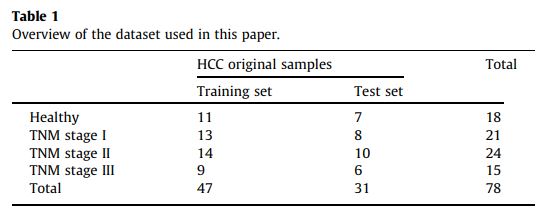 在這項研究中,血清樣本由同濟醫院(同濟大學醫學院,華中科技大學)捐贈用作實驗數據。癌症的階段是根據腫瘤淋巴結轉移(TNM)劃分。通過上述生物過程,60個HCC病例(TNM分期I 21例; TNM分期II 24例;和TNM分期III 15例),每個包含42特徵,和用作對照組18名健康的樣本。每個樣本皆有42維度的特徵向量,根據其峰分佈順序和相對強度,HCC病例分成訓練集(60%)和測試組(40%),如圖表格1。