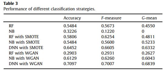 接著我們要比較gan與smote的功效,且為了要測試dnn分類方法的有效性,將使用幾種成見的分類方法來比較。隨機森林(RF)是一個集成學習方法以更高的精度和比其他機器學習模型更好的泛化能力,而樸素貝葉斯(NB)分類器有一個簡單的原則和穩定的分類性能。這兩種算法是選擇作為經典的統計機器學習分類的代表。因此將使用smote、gan與rf、nb、dnn來進行交叉比較。結果如下表: