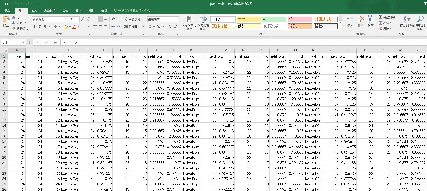 分別為CRE個數、非CRE個數、使用多少主成分、方法名稱、總體預測正確個數、總體準確率、CRE正確個數、非CRE正確個數、CRE準確率、非CRE準確率。