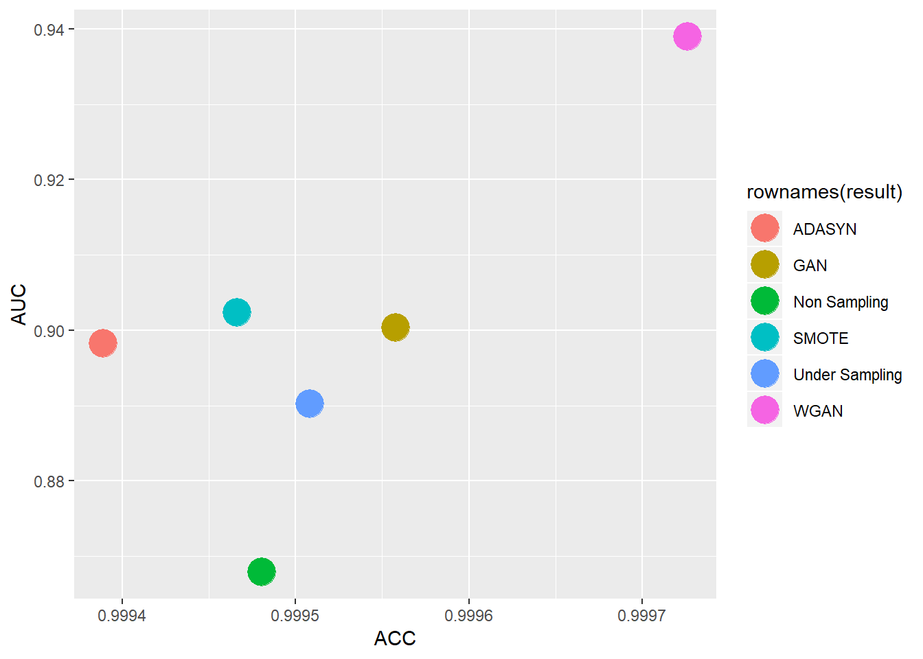 colnames(result) <- c("Non Sampling","Under Sampling","SMOTE","ADASYN","GAN","WGAN")
