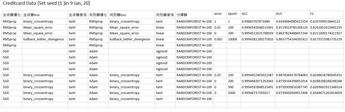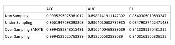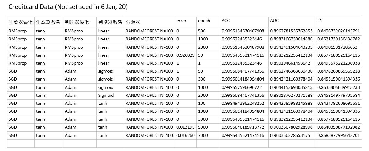 而生成對抗網路則有生成器與判別器兩個神經網路的串接,因此排列組合十分多種,且echo的次數與每個組合的效果並不一定相同,不一定回傳越多次效果越好,因此想先比較完大部分組合後再從中擇優,以下是將之前信用卡資料切分為train:test為1:1後的比較結果,比較傳統oversampling、undersampling與Non Sampling的效果,結果如下圖: