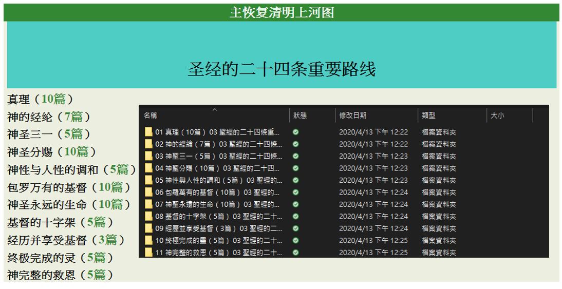 而這次我要爬的網站是之前的中國聖經網站,這次網站他加入了UserAgent,因此過往的爬蟲皆須加上一個header去回應她的request。另外這次需要使用類似branch的方式爬取,從網站上端的結構往下爬取,從最上端到下端分別為view/id/sub三層結構,而sub頁則有數篇文章,我需建立樹狀結構資料夾來存放這些端點的文章,並且按照一定的規則去做命名,最終爬下的網站結果如下四圖,分別為view層/id層/sub層/文章列表/文章格式: