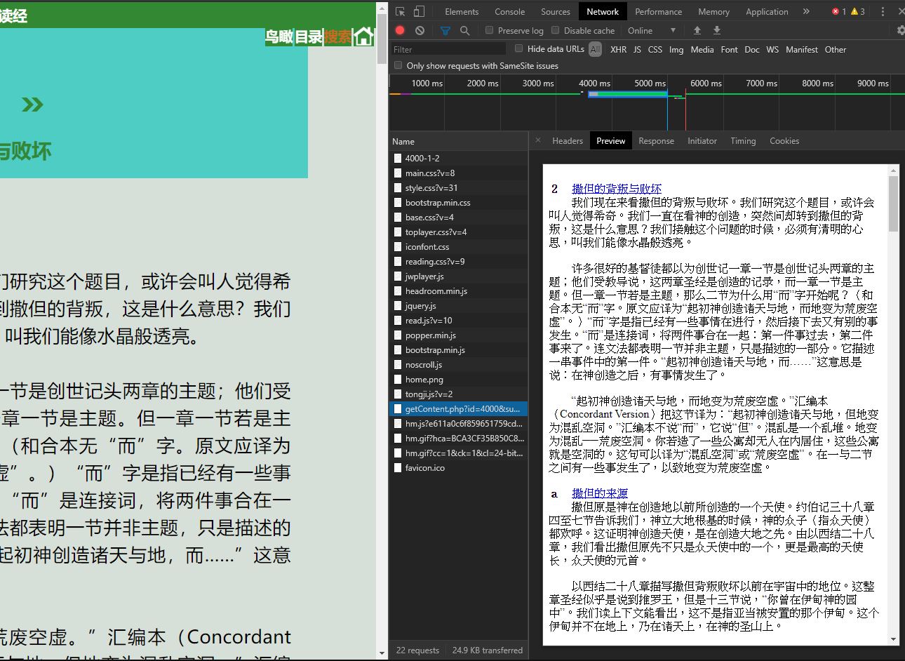 後來發現,文章文字的內容,並不在文章的這個連結內,而是頁面結構先載入,而後內容才進行加載,這個一般稱為delay-load的問題,主要指我們想爬取的內容並非第一時間就在網頁結構上,這會讓一般的爬蟲code失效。原先想要用python的套件來處理這個問題,後來觀察他network的情況後,發現文章載入的連結,如下圖: