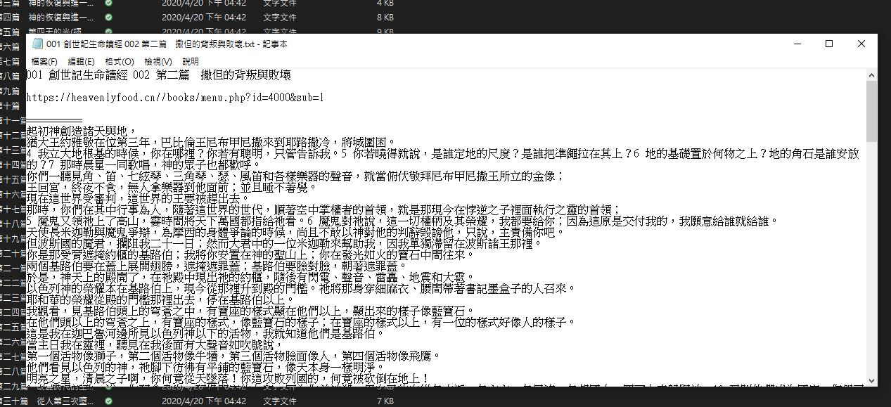 這禮拜也有同網站的內容要爬(https://heavenlyfood.cn/books/index.php?id=4000) ,其主要結構與上星期的篇章雷同,因此沿用上星期的code,只是在最後抓取文章文件的時候,有遇到一些問題,如下圖: